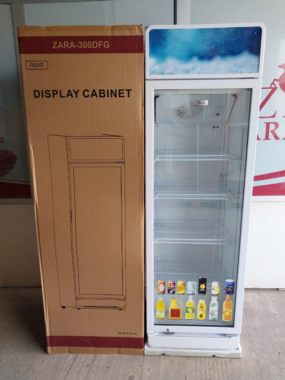 The ZARA-300DFG Display Cabinet is a sleek, vertical refrigerator designed for commercial use, perfect for showcasing beverages and packaged goods. It features a full-length transparent glass door and multiple adjustable wire shelves, ensuring optimal product visibility and organization. The appliance maintains cool temperatures, making it ideal for retail stores, cafes, or offices.